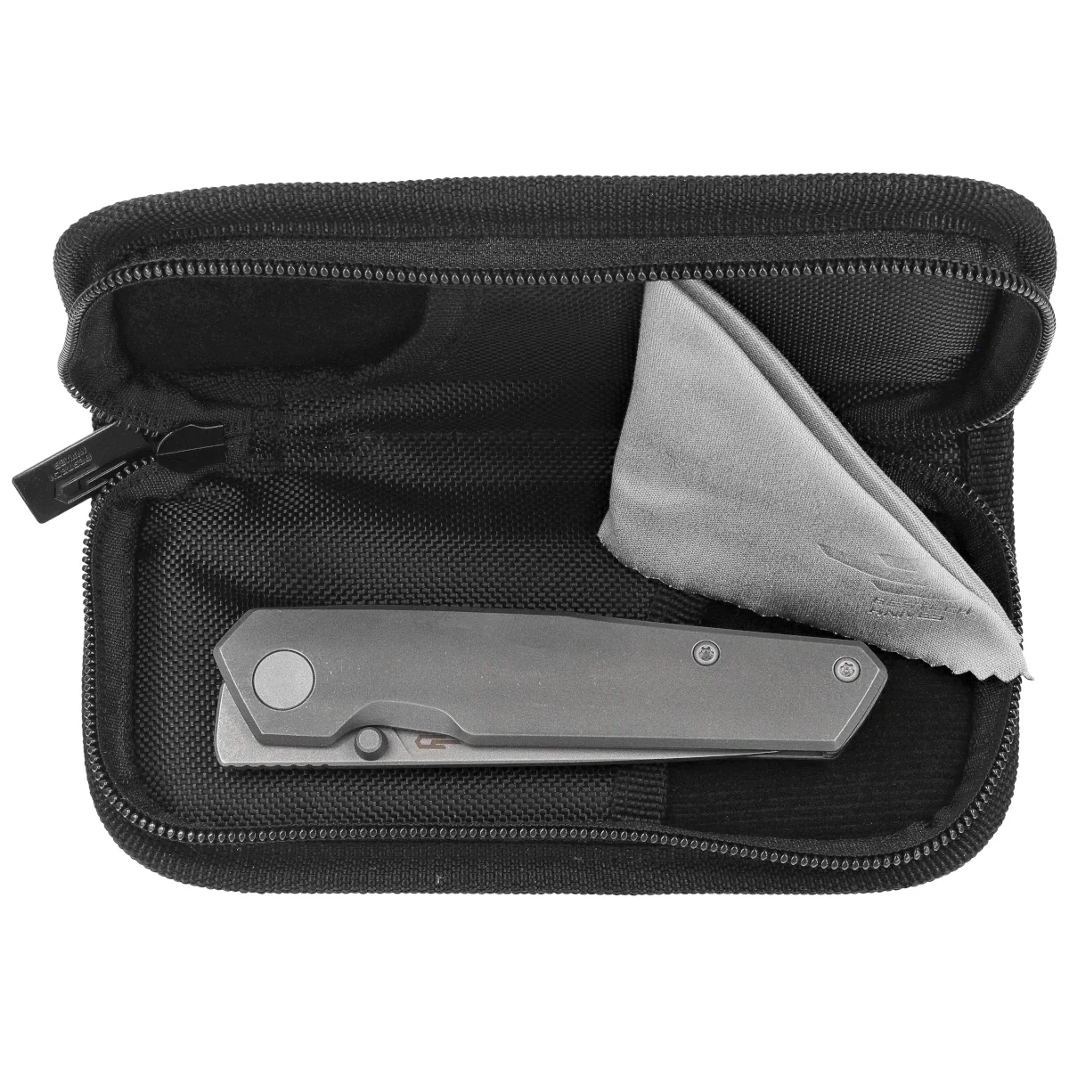 Rękojeść - z tytanu została poddana piaskowaniu, co zapewnia odpowiednią przyczepność i odporność powierzchni na zużycie. Prosty, ergonomiczny kształt dobrze układa się w dłoni, a fazowane krawędzie podnoszą komfort użytkowania. Zintegrowany klips deep carry umożliwia niskoprofilowe przenoszenie, a blokada frame lock gwarantuje stabilność ostrza podczas pracy. Konstrukcja jest sztywna, trwała i pozbawiona zbędnych detali, co czyni ją idealnym wyborem dla miłośników surowego, technicznego designu.