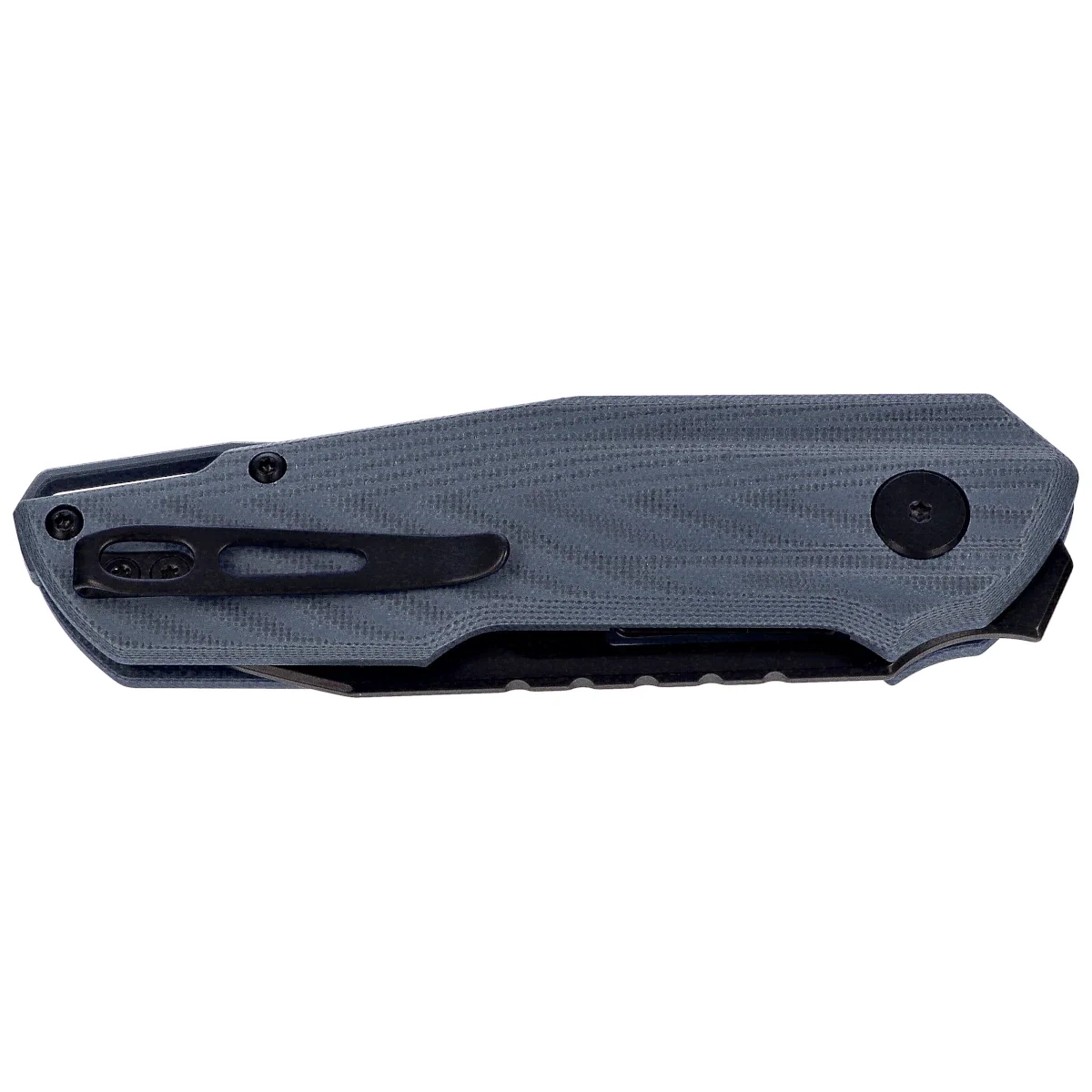 Rękojeść - zaprojektowana z myślą o pełnej kontroli i komforcie użytkowania przy zachowaniu kompaktowych rozmiarów. Okładziny z kompozytu G10 o lekkiej fakturze i matowym wykończeniu zapewniają pewny chwyt, nawet w wilgotnym środowisku. Ergonomiczne wyprofilowanie z wyraźnym podcięciem na palec wskazujący poprawia stabilność pracy przy precyzyjnych zadaniach. Na grzbiecie znajduje się frezowanie (jimping), które dodatkowo zwiększa przyczepność kciuka. Wewnętrzne stalowe linery wzmacniają całą konstrukcję i są integralną częścią systemu blokady liner lock, który pewnie utrzymuje głownię w pozycji otwartej. Klips deep carry pozwala na dyskretne przenoszenie noża w kieszeni, a otwór w tylnej części rękojeści umożliwia montaż linki zabezpieczającej. Całość uzupełnia dekoracyjny pivot z graficznym detalem – znakiem firmowym projektanta.