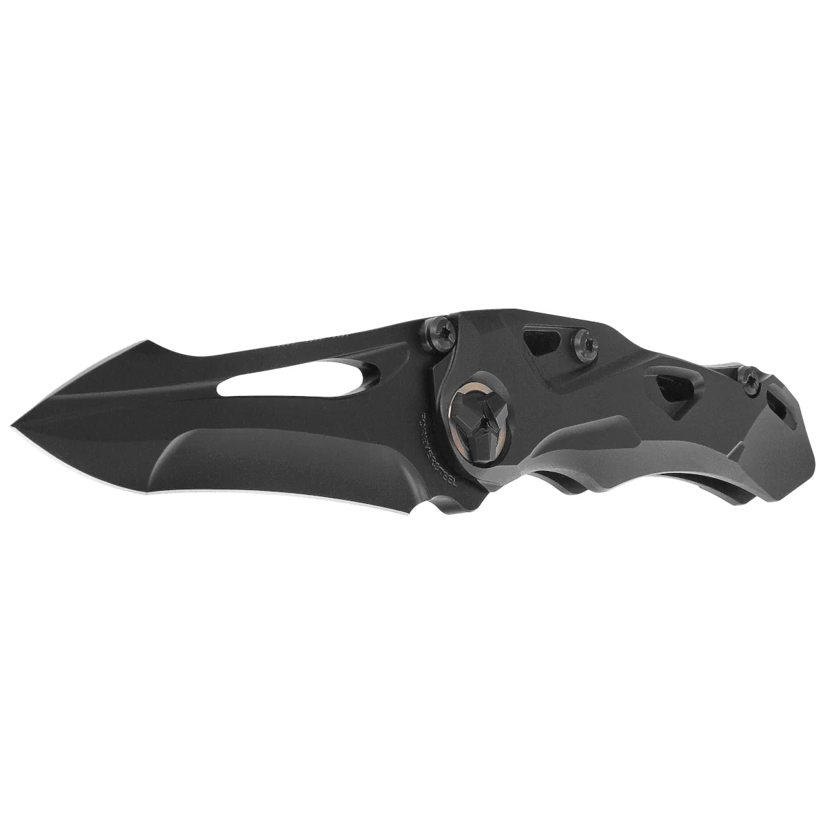 Głownia - typu harpoon, pokryta czarną powłoką DLC. Długa krawędź tnąca, zbiega się w kierunku ostrego jak igła czubka szerokiej klingi. Grubość ostrza i zbrocze zapewniają wysoką wytrzymałość. Zastosowano tu szlif mieszany, w tylnej części jest to wklęsły szlif do cięcia i prac precyzyjnych tzw Hollow Ground Primary Bevel. W przedniej części mamy wysoki, płaski szlif wzmacniający czubek Flat Ground. Nóż możemy otworzyć przy użyciu płetwy front flippera lub podłużnego otworu w klindze (Thumb Hole). Całość blokowana jest nowoczesną blokadą Frame Lock ze stalową wkładką zapobiegającą wycieraniu się czoła blokady.