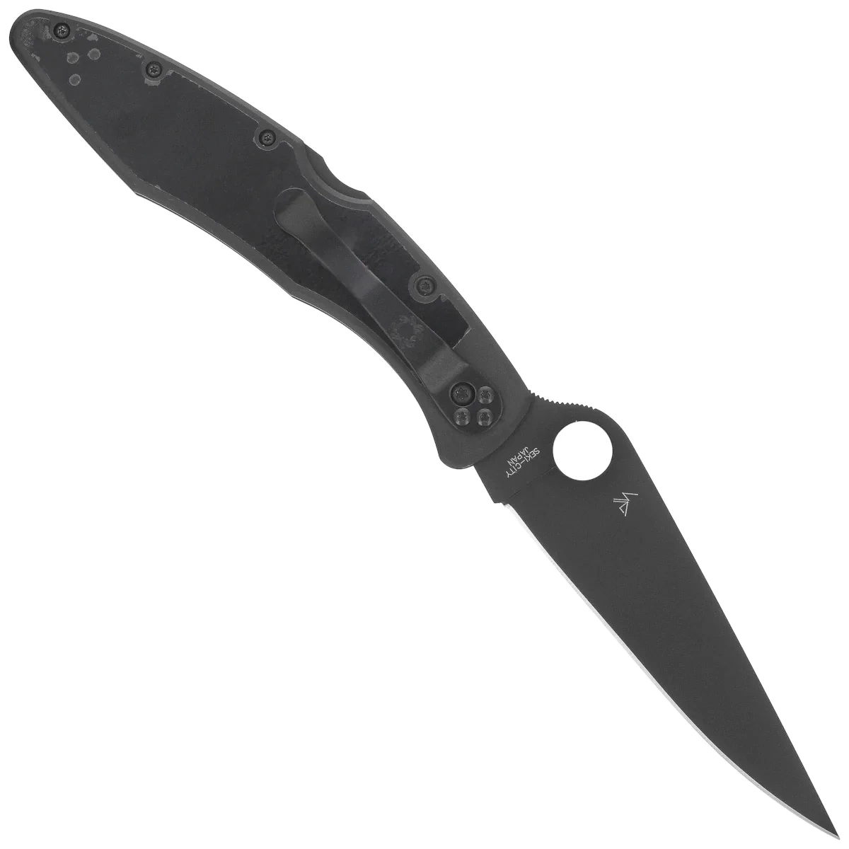 Głownia - o profilu clip point z wyraźnym brzuścem i smukłym czubkiem zapewnia precyzyjne cięcie oraz skuteczną penetrację. Klinga wykonana z japońskiej stali VG-10 oferuje znakomitą odporność na korozję oraz długotrwałe trzymanie krawędzi. Szlif płaski poprawia geometrię cięcia i obniża masę głowni, zwiększając kontrolę. Czarna powłoka zmniejsza odblaski i podkreśla taktyczny charakter noża. Otwór SpyderHole™ pozwala na łatwe otwieranie jedną ręką – również w rękawicach. Karbowane oparcie pod kciuk (jimping) umożliwia stabilne prowadzenie ostrza, a blokada Back Lock z systemem Boye Detent zabezpiecza przed przypadkowym zwolnieniem klingi pod naciskiem.