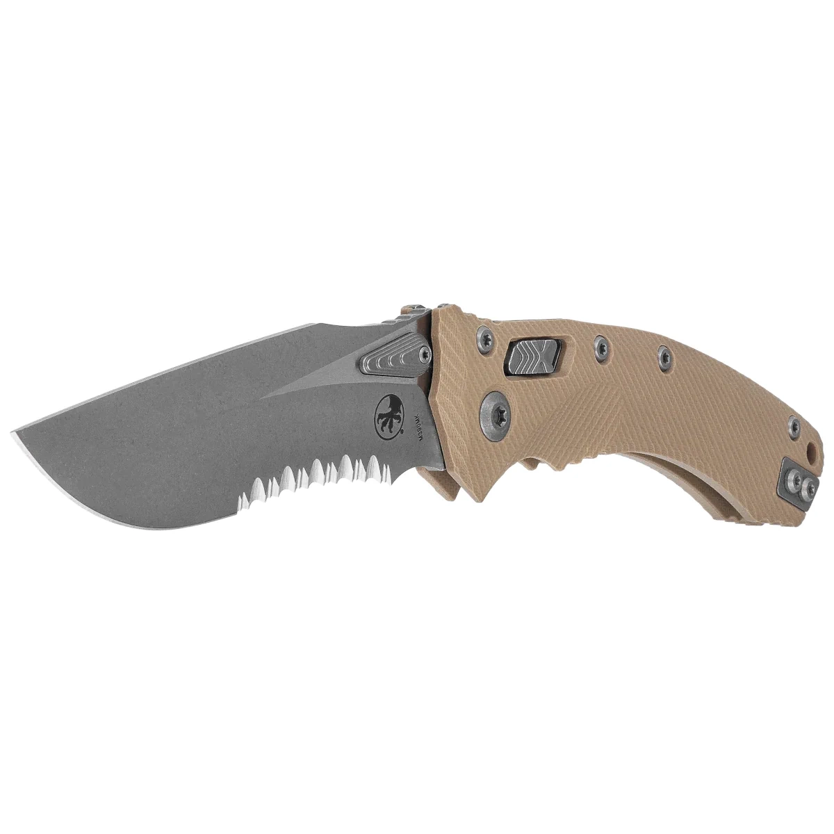 Rękojeść - wykonana z wytrzymałego kompozytu G10, dla lepszego uchwytu pokryta wyfrezowanymi liniami (Fluted). Szeroki suwak blokady z charakterystyczną dla firmy Microtech schodkową strukturą X. Obie okładziny zostały skręcone przy pomocy solidnego, backspacera. Dwustronny (prawa / lewa) tytanowy klips pozwala dyskretnie nosić nóż w pozycji tip-up. Nad klipsem lanyard hole, miejsce na linkę zabezpieczającą lub ozdobną.