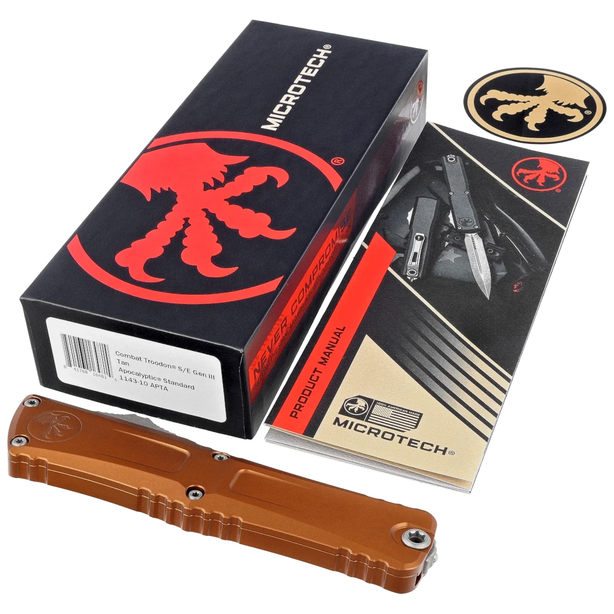 Combat Troodon Gen III S/E Tan Aluminium, Apocalyptic ten największy z noży automatycznych, to szczyt precyzyjnej inżynierii i taktycznej sprawności w dziedzinie noży OTF (Out The Front). Zbudowany z myślą o szerokim spektrum zastosowań użytkowych, może pochwalić się większym o 25% rozmiarem w porównaniu do flagowego Troodona. Precyzyjnie wykonany, wyposażony w wyrafinowany i piekielnie szybki mechanizm wysuwający ostre jak brzytwa ostrze. W 100% wyprodukowany i zmontowany w USA. Projekt Anthony'ego Marfione, knifemakera i właściciela Microtech Knives.