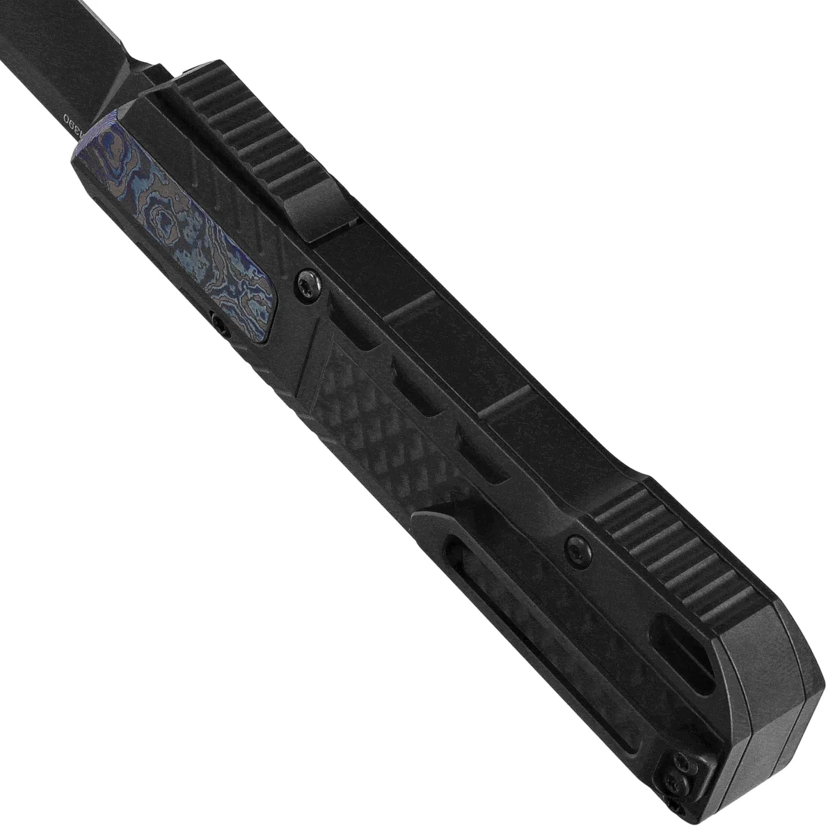 Rękojeść - wykonana na frezarkach CNC z tytanu, z trójwymiarową teksturą. Fazowane krawędzie okładek eliminują ostre ranty oraz poprawiają pewność uchwytu. Wkładka z tytanu barwionego płomieniowo daje wizualny kontrast i poprawia uchwyt. Po prawej stronie kunsztowny suwak do wysuwania/wsuwania klingi. Jednopozycyjny tytanowy (prawa) klips deep carry umożliwia dyskretne przenoszenie noża w kieszeni w pozycji tip-down (czubkiem ostrza do dołu).