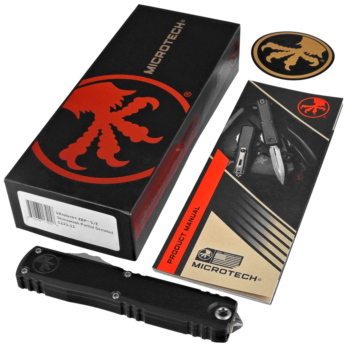 • Ultratech Gen 3 ZBP S/E Black Aluminium, Stonewashed P/S to ulepszona wersja ikonicznego noża Microtech: nowy zbijak do szyb, system Crud Kutter, Dual-Fuel Drive Train oraz Zero Blade Play™ – brak luzu ostrza po rozłożeniu.