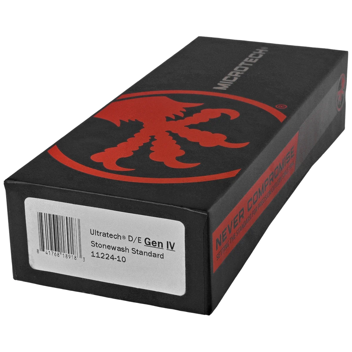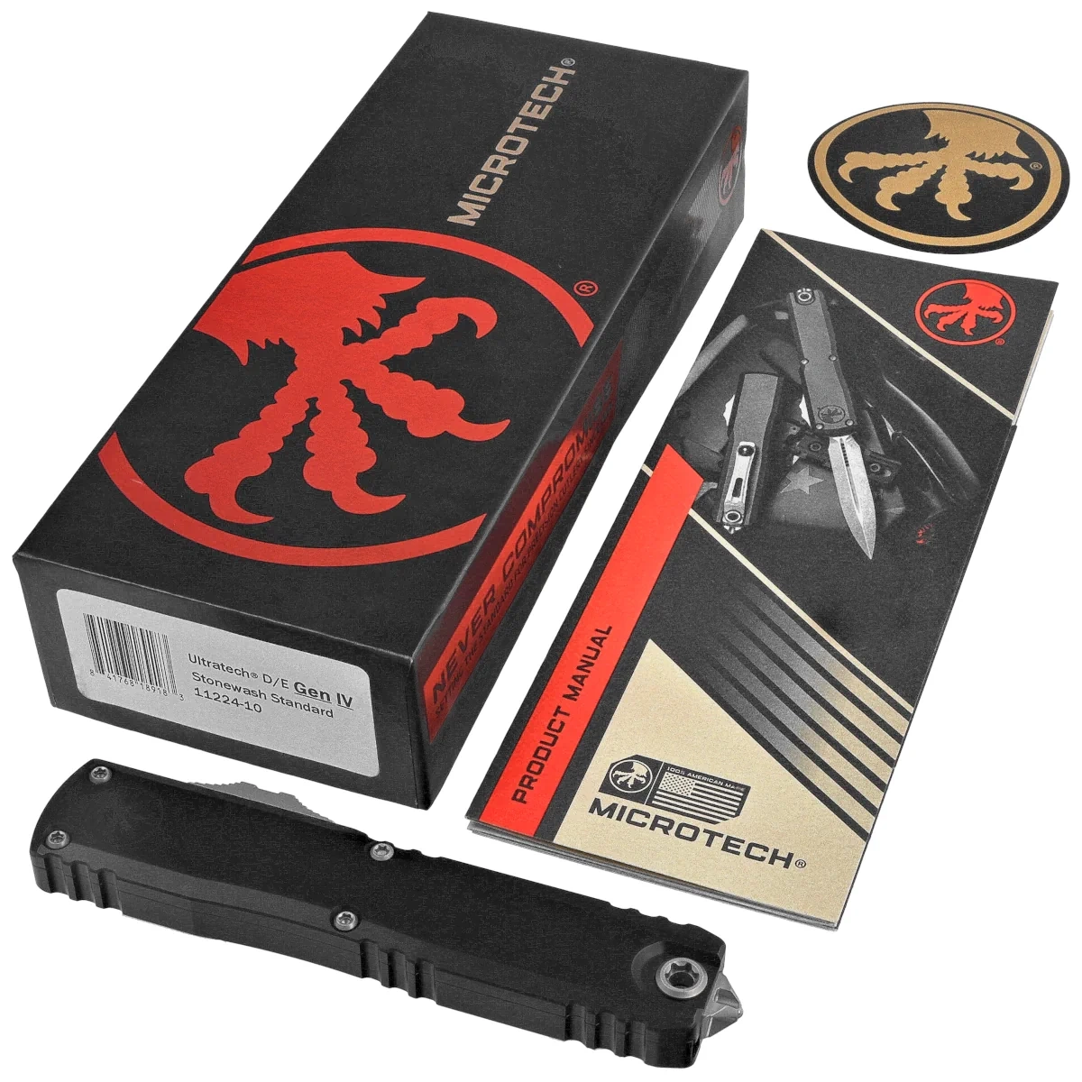 Ultratech Gen IV D/E Black Aluminium, Stonewashed to pełnowymiarowy nóż automatyczny OTF (Out The Front) z serii Ultratech. Czwarta generacja wyróżnia się szeregiem usprawnień, takich jak; Crud Kutter™, Dual-Fuel Drive Train™. Przeprojektowano również rękojeść, wyposażając ją w rozwiązania znane z innych modeli. Pracujący w trybie D/A (Double Action), umożliwia błyskawiczne wysunięcie i schowanie ostrza za pomocą jednego ruchu kciuka. Projekt autorstwa Tony’ego Marfione, właściciela Microtech Knives, łączy w sobie nowoczesny design z najwyższą jakością wykonania.