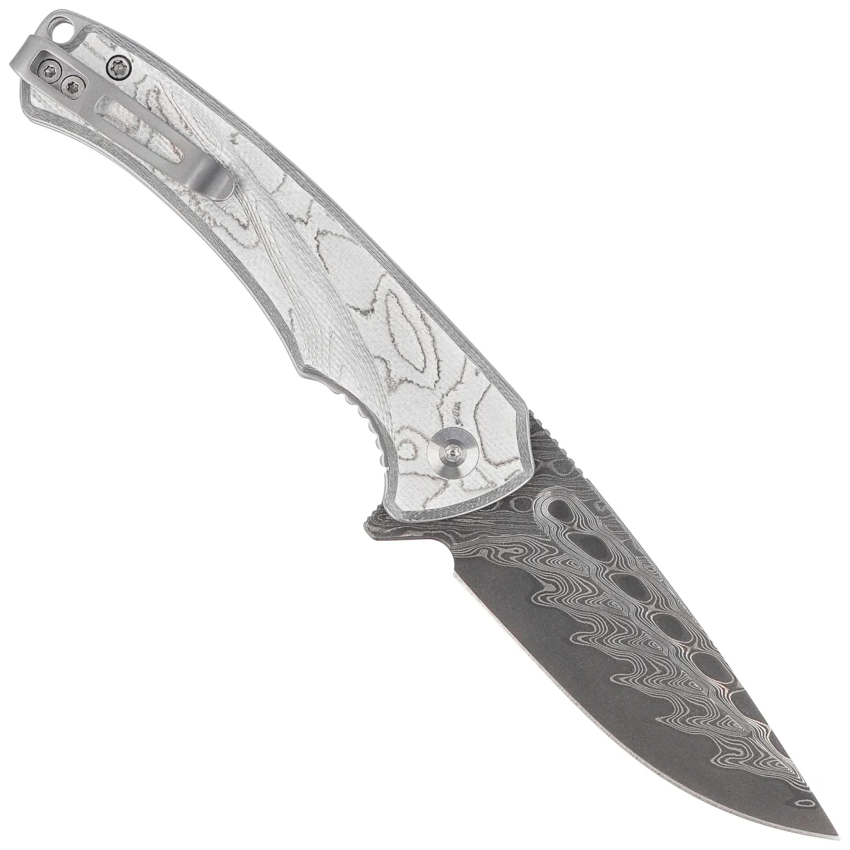 Głownia - typu drop point została wykonana z wytrzymałego nierdzewnego damastu, oferującego dobrą retencję ostrości, odporność na rdzę oraz łatwość ostrzenia. Szlif wklęsły zapewnia precyzyjne prowadzenie ostrza, a trawienie acid etched podkreśla linię wzorów stali. Otwieranie odbywa się za pomocą flippera, który w połączeniu z łożyskami ceramicznymi gwarantuje aksamitnie płynny ruch ostrza – bez oporu, bez hałasu, z natychmiastową gotowością do działania.