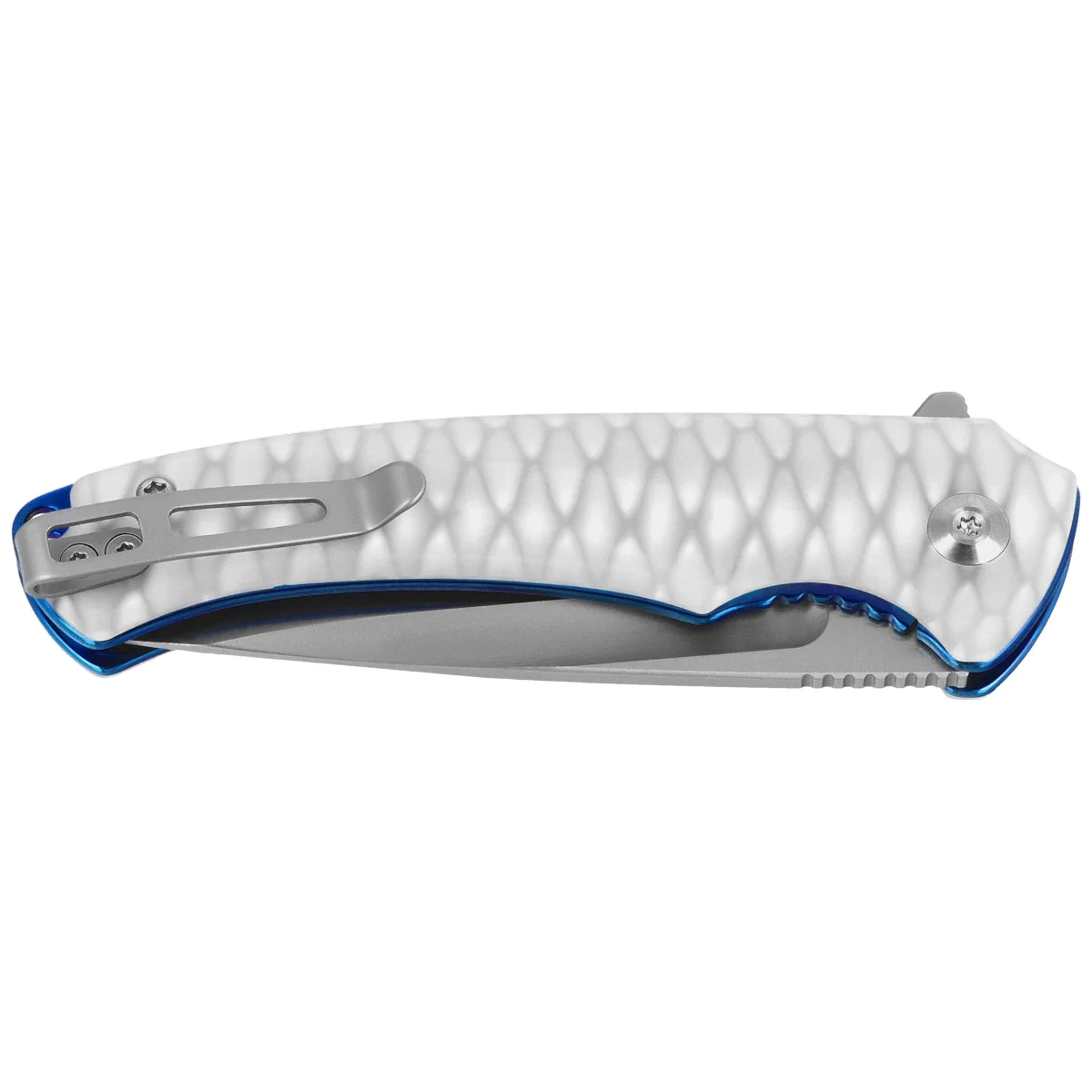 Rękojeść - z biało szarej żywicy charakteryzuje się doskonałą wytrzymałością mechaniczną i niewielką wagą. Jej tekstura poprawia chwyt, a ergonomiczny profil z wycięciami ułatwia precyzyjną kontrolę noża w każdej pozycji dłoni. Wewnętrzne stalowe linersy zwiększają sztywność konstrukcji, a blokada liner lock zapewnia bezpieczeństwo i niezawodność w codziennym użytkowaniu. Na uwagę zasługują również detale wykończenia przypominające łuskę gada, które podkreślają estetykę modelu, nadając mu subtelny, kolekcjonerski akcent. Klips typu deep carry umożliwia niskoprofilowe przenoszenie, a lanyard hole zwiększa funkcjonalność w warunkach terenowych. Całość tworzy doskonale wyważone narzędzie EDC o wyjątkowej estetyce.