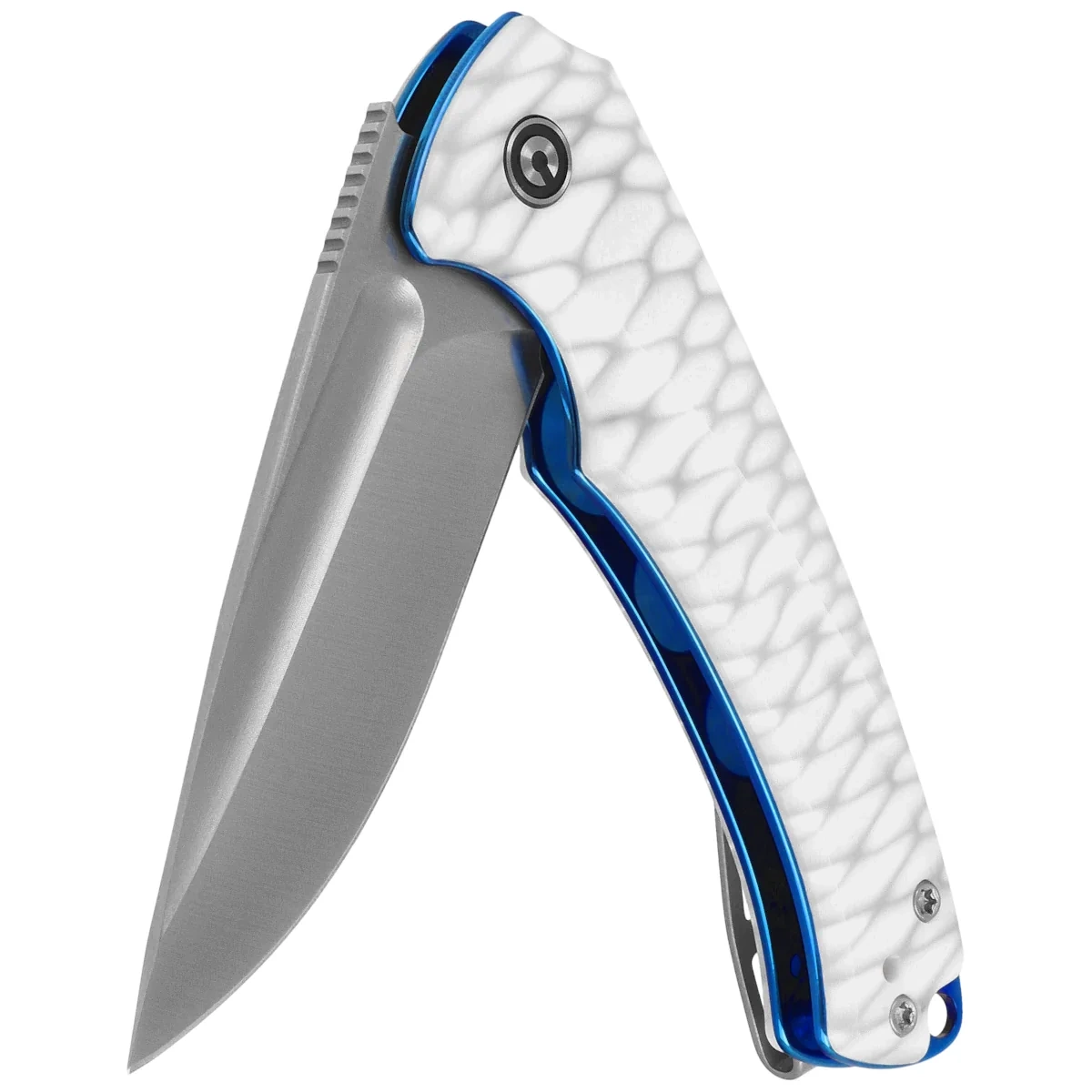 - Voidflare Greyish White Resin, Satin – elegancki nóż składany EDC z ostrą i wytrzymałą głownią ze stali 14C28N, osadzony na lekkiej i teksturowanej rękojeści z kompozytu żywicy. Wzór łuski na rękojeści i dynamiczna linia podkreślają nowoczesny styl.