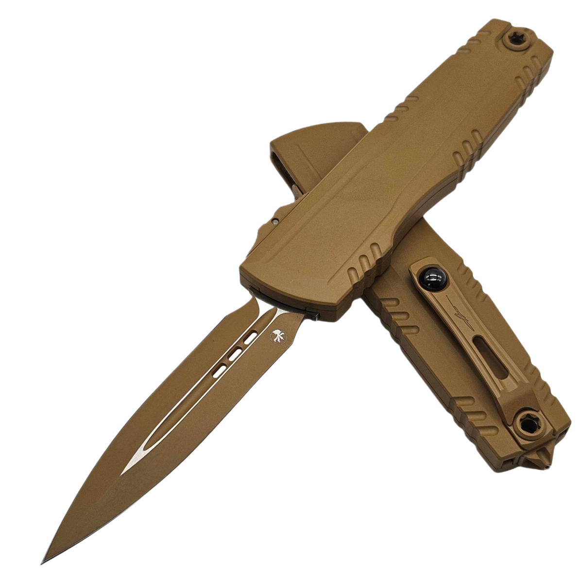 Rękojeść - wykonana z doskonałą precyzją w technologii 3D na frezarkach CNC, z pokrytego twardą powłoką Cerakote™ aluminium 6061-T6. Na głowni głęboko grawerowane logo Microtecha, szpon drapieżnego ptaka. Faktura powierzchni rękojeści powoduje, że nóż nie ślizga się w dłoni podczas używania. Na grzbiecie i dole rękojeści znajdują się nacięcia (jimping) dla pewniejszego chwytu. Innowatorska, bezśrubowa konstrukcja rękojeści. Smukły profil oraz frezowany dwupozycyjny (prawa/lewa) masywny, tytanowy klips typu deep carry, umożliwiają dyskretne przenoszenie noża w kieszeni, w pozycji tip-down (czubkiem ostrza do dołu).  Wyposażony w gładką kulkę rollerball, dzięki której nóż z łatwością wsuwa się do kieszeni nie niszcząc brzegów kieszeni. Rękojeść zakończono nową wersją zbijaka do szyb, stalowa piramida, w którą wprasowano kulkę z węglika wolframu. Z tyłu rękojeści otwór do przeplecenia linki ozdobnej.