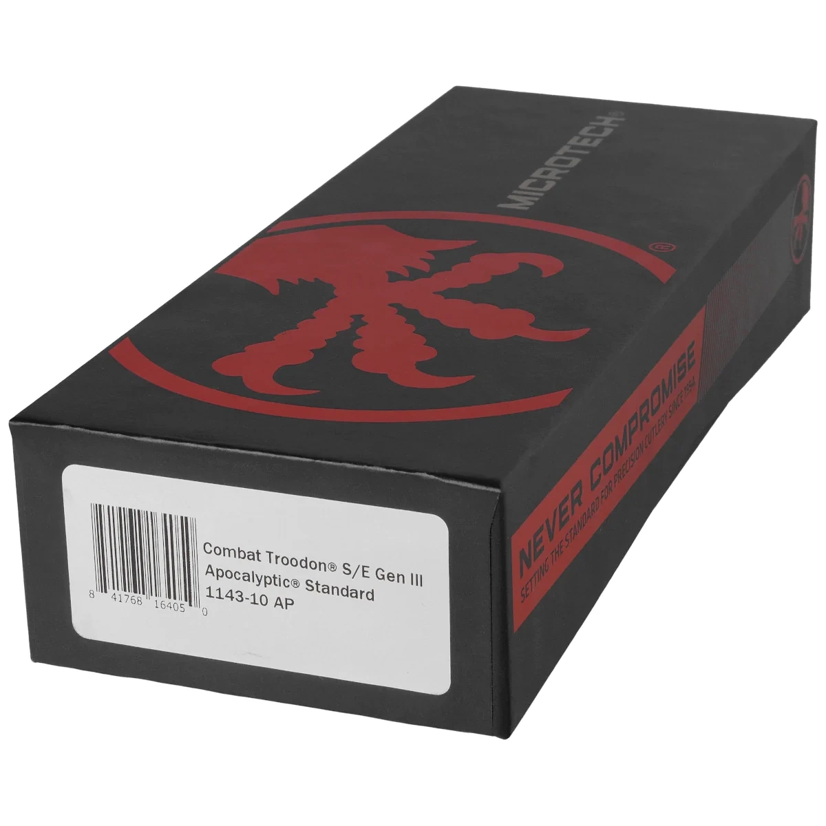 Combat Troodon Gen III S/E Black Aluminium, Apocalyptic ten największy z noży automatycznych, to szczyt precyzyjnej inżynierii i taktycznej sprawności w dziedzinie noży OTF (Out The Front). Zbudowany z myślą o szerokim spektrum zastosowań użytkowych, może pochwalić się większym o 25% rozmiarem w porównaniu do flagowego Troodona. Precyzyjnie wykonany, wyposażony w wyrafinowany i piekielnie szybki mechanizm wysuwający ostre jak brzytwa ostrze. W 100% wyprodukowany i zmontowany w USA. Projekt Anthony'ego Marfione, knifemakera i właściciela Microtech Knives.