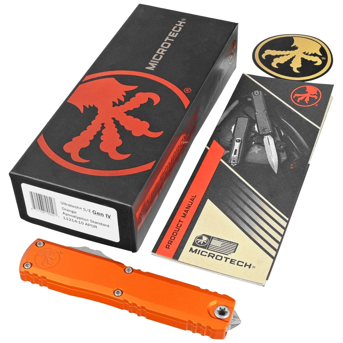 Ultratech Gen IV S/E Orange Aluminium, Apocalyptic to pełnowymiarowy nóż automatyczny OTF (Out The Front) z serii Ultratech. Czwarta generacja wyróżnia się szeregiem usprawnień, takich jak; Crud Kutter™, Dual-Fuel Drive Train™. Przeprojektowano również rękojeść, wyposażając ją w rozwiązania znane z innych modeli. Pracujący w trybie D/A (Double Action), umożliwia błyskawiczne wysunięcie i schowanie ostrza za pomocą jednego ruchu kciuka. Projekt autorstwa Tony’ego Marfione, właściciela Microtech Knives, łączy w sobie nowoczesny design z najwyższą jakością wykonania.