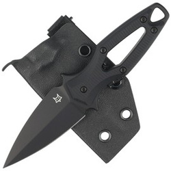 Aka Black G10, Black Top Shield, an ultralight, compact neck knife from FOX. Excellent design by Denis Simonutti. Spear point blade made of Elmax steel, coated with Top Shield®. Grip comfort is improved by G10 inserts. Flat kydex sheath.