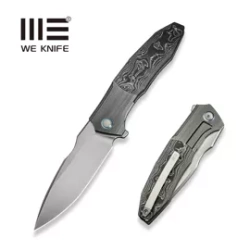 WE-Guthrie Gray Titanium/Nebula Fat Carbon, Polished Gray/Satin, a large EDC folding knife designed by Jason Guthrie. Comfortable Handle with titanium bolsters and carbon fiber, utilitarian 20CV CPM steel Blade, strong construction.