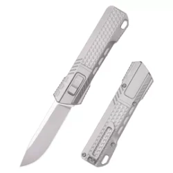 RT-Sharp Leopard Gray Titanium, Hand Grinding Pearlescent kompaktowy folder EDC z młodej manufaktury Remette Knives. OTF z wysuwanym dzięki sile grawitacji ostrzem ze stali Böhler M390. Wygodna rękojeść z tytanu z nowatorskim systemem uwalniania ostrza.